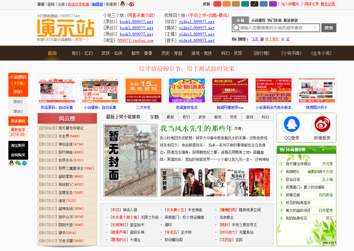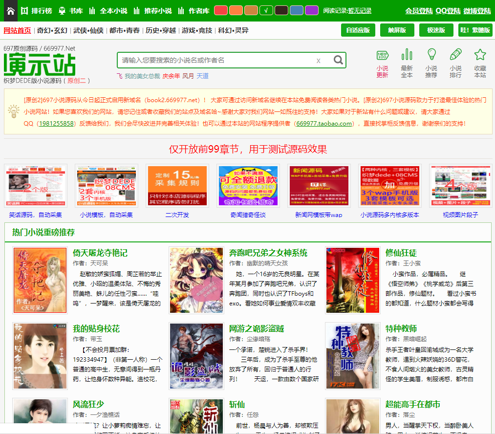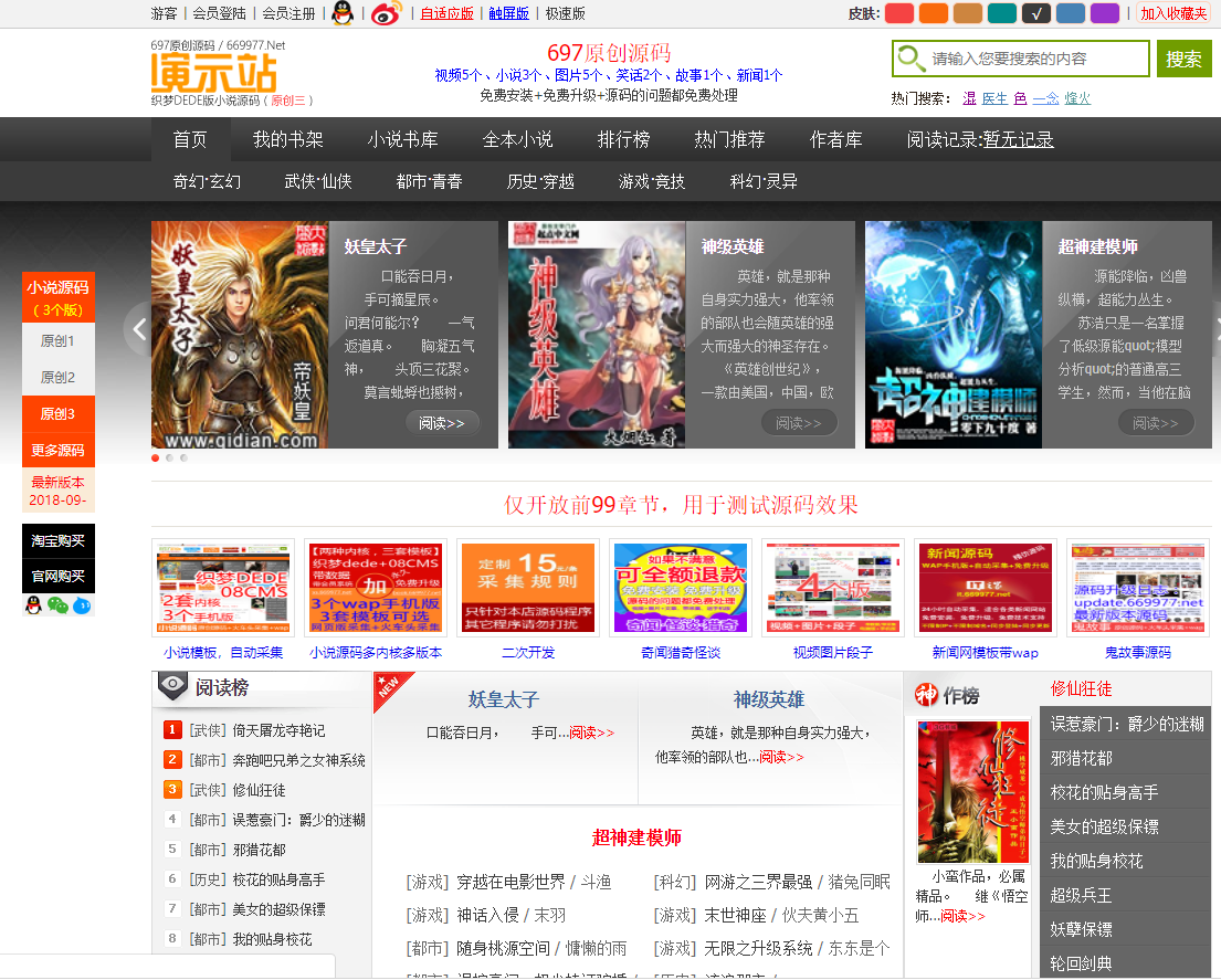 注:数字“3000”代表这个版本的源码带3000本小说的数据,共三个版本,分别为0、50、3000;网站程序(697中文网)[dedeCMS].rar中包含4个站,都是**的站点,也可以单独绑定域名;数据库为mysql,为utf-8格式。