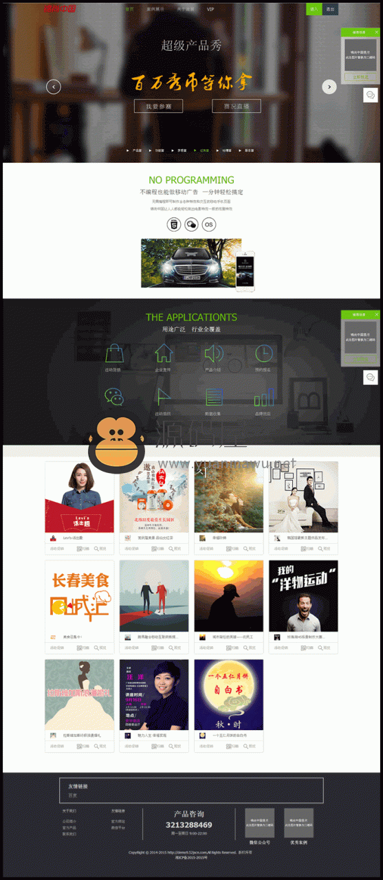 本源码是一款针对移动互联网营销的手机网页DIY制作工具,用户可以编辑手机网页,分享到社交网络,通过报名表单收集潜在客户或其他反馈信息。用户通过本源码无需掌握复杂的编程技术,就能简单、轻松制作基于HTML5的精美手机幻灯片页面。同时,本源码与主流社会化媒体打通,让用户通过自身的社会化媒体账号就能进行传播,展示业务,收集潜在客户。本源码提供统计功能,让用户随时了解传播效果,明确营销重点、优化营销策略。提供免费平台,用户零门槛就可以使用本源码进行移动自营销,从而持续积累用户。本源码适用的地方包括:企业宣传,产品介绍,活动促销,预约报名,会议组织,收集反馈,微信增粉,网站导流、婚礼邀请、新年祝福等。